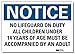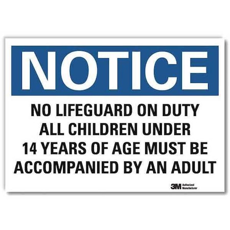 Notice Sign, Horizontal Rectangle, Number of Printed Sides 1, English, Sign Format Traditional OSHA, Sign Legend No Lifeguard On Duty All Children Under 14 Years Of Age Must Be Accompanied By An Adult, Sign Legend Background Color White, Sign Legend Style Text
