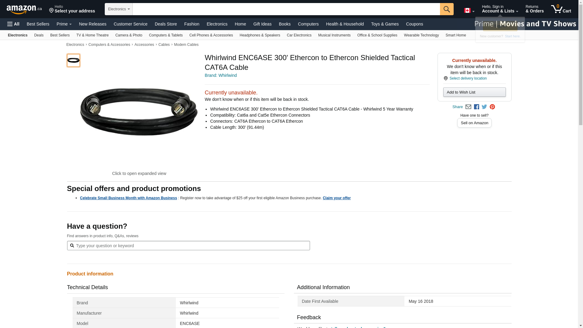 Whirlwind ENC6ASE300 - Cable - Ethernet, Cat6A Ethercon to Cat6A Ethercon, tactical Cat6a cable, shielded, 300'