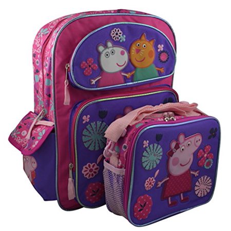 <ul> <li>Polyester</li> <li>Peppa Pig Girls' Deluxe 16" Backpack Bookbag w/ Deluxe Lunchbag Set</li> <li>Brilliant colors for dazzling effect on Peppa Pig. Sparkly design! perfect for school and vacations! Well known character that your child will love having with them. The perfect set all year round!</li> <li>Features one Main Compartment, one side mesh pocket and one regular side pocket. Backpack Dimensions (in inches): 16 x 12 x 4</li> <li>Lunch Kit Product Dimensions (in inches):10 x 8 x 3.5.</li> <li>Insulated lunch box with easy to clean material inside for those messy days</li> <li>Made of an easy to clean and very durable 100% polyester</li> </ul>