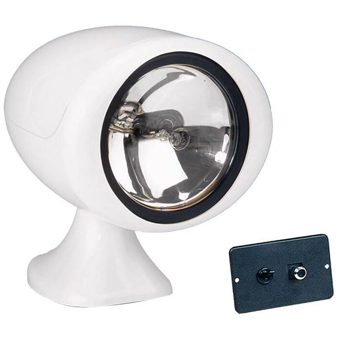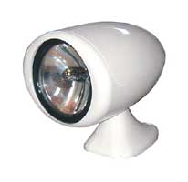 100,000 CP. Easily replaceable 5" halogen sealed beam. Sealed beam halogen lamp. Full 320° horizontal rotation, 75° vertical sweep. Remote control and 15' cable included. Complete with joystick remote control with automatic 20° sweep feature, two speed movement - Fast for searching, slow for pinpointing target. Patented clutch mechanism prevents motor damage when running against limit stops. 10 amp fuse. Tough thermoplastic, white UV stable housing and base.