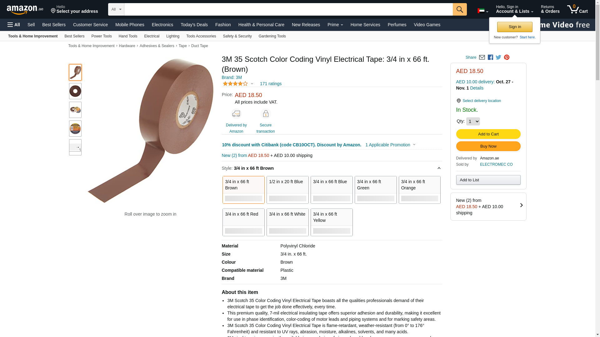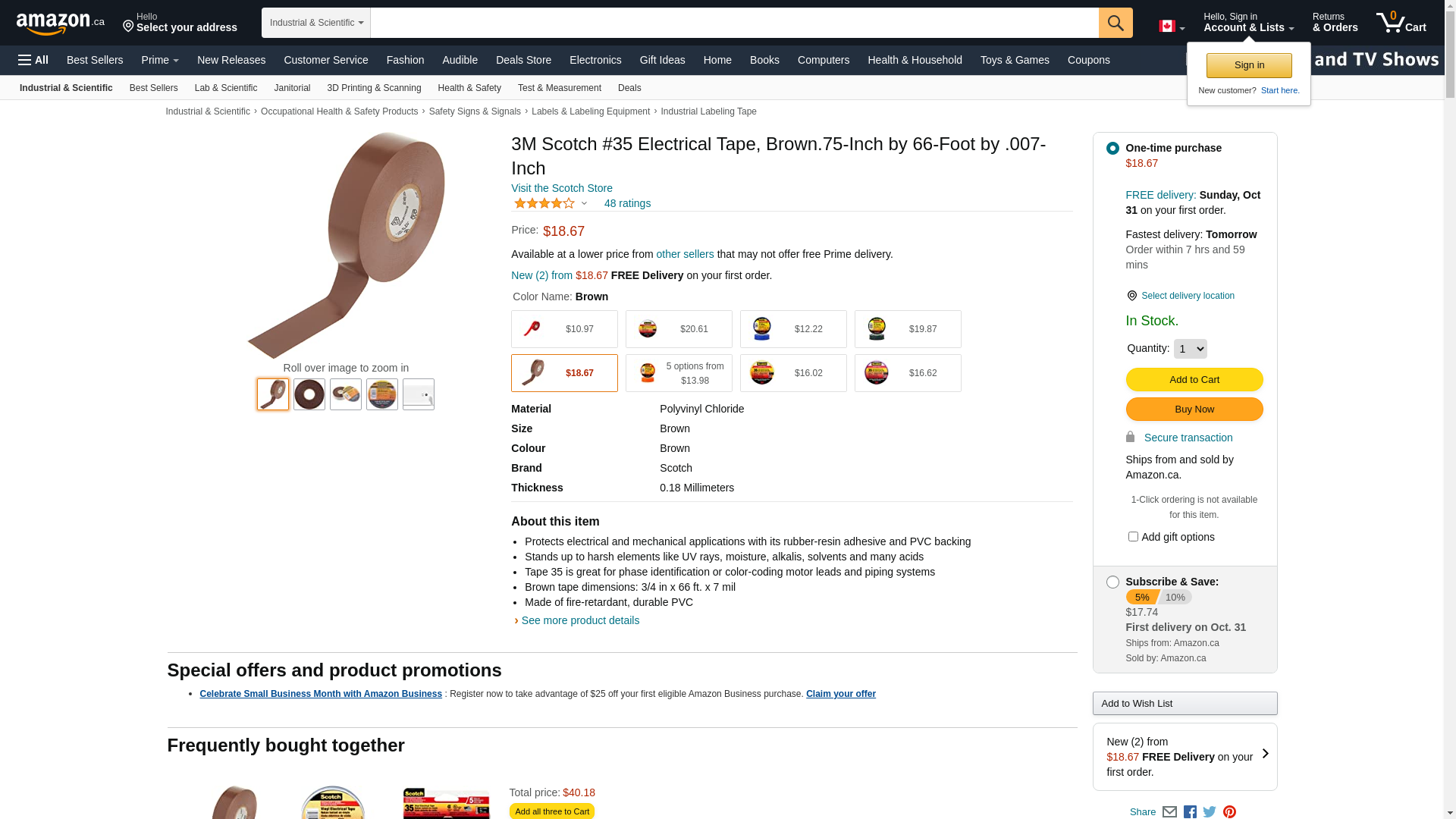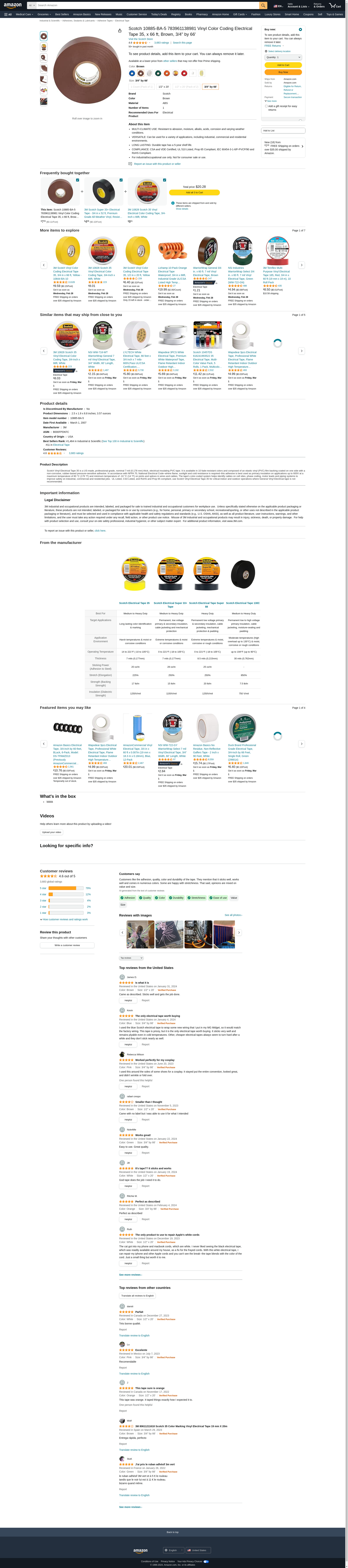 Scotch 10885-BA-5 783961138981 Vinyl Color Coding Electrical Tape 35, x 66 ft, Brown, 3/4" by 66'