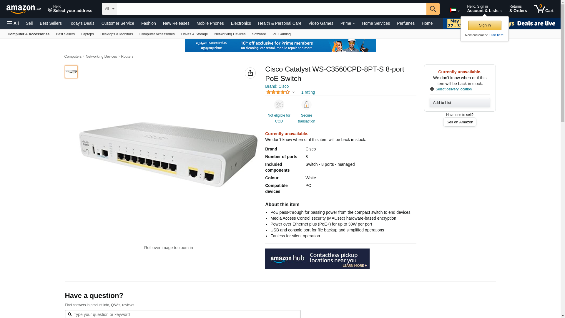 | Feature | Cisco Catalyst WS-C3560CPD-8PT-S Ethernet Switch |