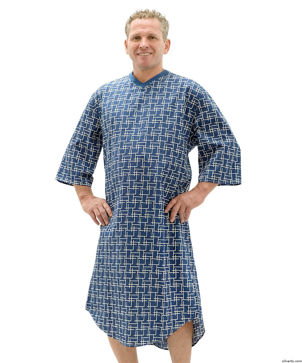 Silverts 500511803 Mens Adaptive Cotton Hospital Patient Nightgowns with Open Back & Snap Back - Navy Geo, 3XL
