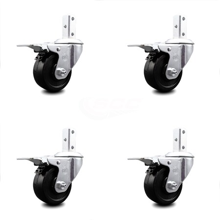 Swivel Square Stem Caster Set 4 w/3” x 1.25” Black Soft Rubber Wheel-7/8” x 2” Square Stem with (3) 17/64” Diameter Mounting Holes-Includes 4 Total Lock Brakes-700lbs. Cpty/Caster-Service Caster Brand