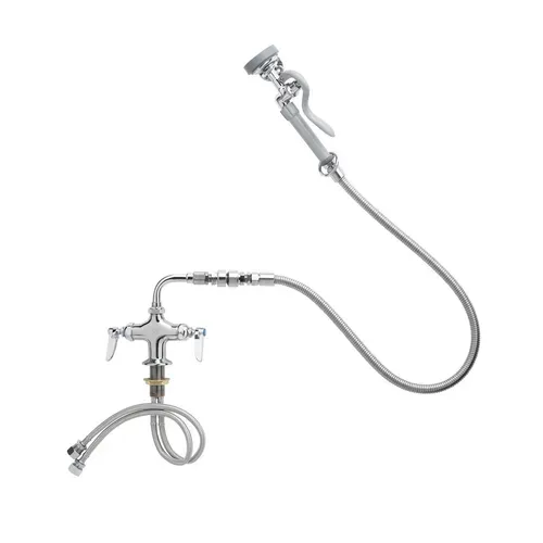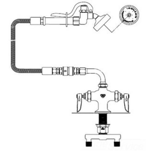 TS Brass B-0200-44H-VB Mixing Faucet Kit, single, deck mounted, includes: angled spray valve 1.42 gpm (B-107-035), (2) - B-0200-44H-VB - T&S Brass T&S Brass B-0200-44H-VB Single Hole Deck Mount Pre Rinse Faucet W/ 4" Centers, B-0107-035 Spray ValvTS Brass B-0200-44H-VB Mixing Faucet Kit, single, deck mounted, includes: angled spray valve 1.42 gpm (B-107-035), (2) - B-0200-44H-VB - T&S BrassSingleDeck MountedIncludes: Angled Spray Valve 1.42 Gpm (B-107-035)(2) 150A Optional Tailpiece & Nut For 1/4" Npt ConnectionVacuum BreakerEterna Cartridges With Spring Checks & Lever Handles With Color Coded Indexes90 Swivel Adapter44" Stainless Steel Flex HoseDummy Wall Hook With (2) Plated Screws & 4" Spreader With 1/2" Npt Male InletsMount: DeckCenters: SingleNozzle Mount: Swing/SwivelValve Type: MixingHose Length: 44"Nozzle Type: None Pre-rinse Faucets B020044