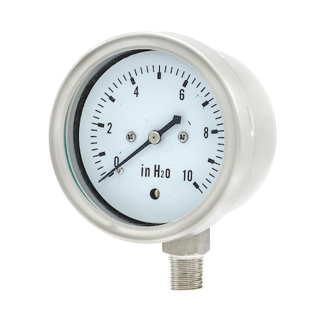 LP1-SS-254-10 PIC Gauges Low Pressure Gauge, 2-1/2" Dial, 0-10" Wc, 1/4" Stainless Steel Case, 316 Ss Internals, Lower Mount