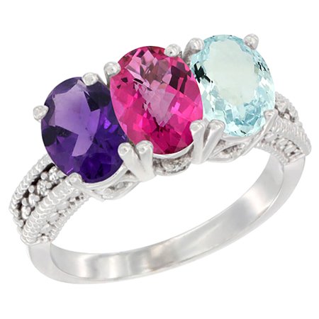 14K White Gold Natural Amethyst, Pink Topaz & Aquamarine Ring 3-Stone 7x5 mm Oval Diamond Accent, sizes 5 - 10