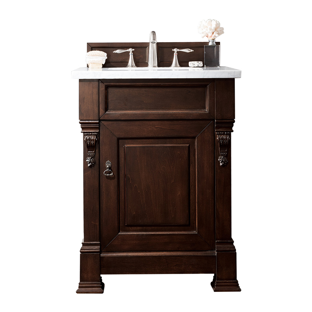 The Brookfield 147-114-V26-BNM-3AF 26", single sink, Burnished Mahogany vanity by James Martin Furniture features hand carved accenting filigrees and raised panel doors. Single door cabinet with a shelf for additional storage space. The look is completed with Antique Brass finish door and drawer pulls. Matching decorative wood backsplash is included.,The Brookfield Collection by James Martin Furniture features hand carved accenting filigrees and raised panel doors. Various storage options including doors opening to shelves for storage and drawers. This collection is offered in a variety of finish colors. Each cabinet is configured to work with our variety of either 2cm, 3cm, or 4 cm countertops. The look is completed with Antique Brass finish door and drawer pulls. A matching dec
