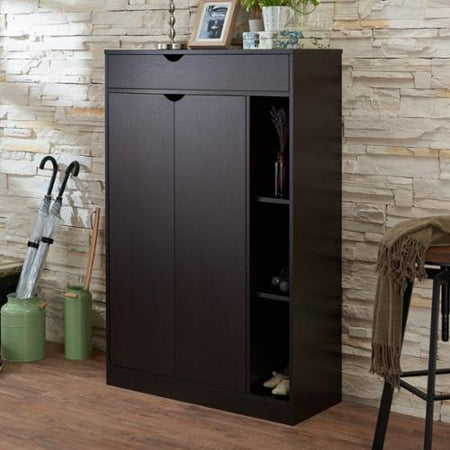 Tuck your heels, sandals, sneakers, dress shoes and more within this spacious storage piece. The Edmund Shoe Cabinet offers eight variously sized shelves to accommodate all your footwear and accessories, making it a must-have for any space-conscious household. <br /> <br /> <ul> <li>Furniture Pattern: Solid</li> <li>Furniture Room: Bedroom, Living Room</li> <li>Product Features: Includes Hardware</li> <li>Material: MDF, Metal, Veneer</li> <li>Style: Modern, Transitional</li> <li>Dresser Type: Shoe Cabinet</li> <li>Assembly: Assembly Required</li> <li>Size: 1-drawer</li> <li>Exact Color: Cappuccino</li> <li>Finish: Brown Finish</li> <li>Color: Brown</li> <li>Set includes: One (1) shoe cabinet</li> <li>Finish: Cappuccino</li> <li>Three (3) open side shelves with ample vertical space</li> <li>Cabinet hides five (5) wide shelves behind the double doors</li> <li>Slim drawer with cut-out handle design and easily accessible via metal glides</li> <li>Warm cappuccino finish creates a sleek appearance and pops against any light setting</li> <li>All dimensions are approximate</li> <li>Drawer dimensions: 3.75 inches high x 28 inches wide x 11.75 inches deep</li> <li>Overall dimensions: 48.25 inches high x 30.25 inches wide x 13 inches deep</li> </ul>