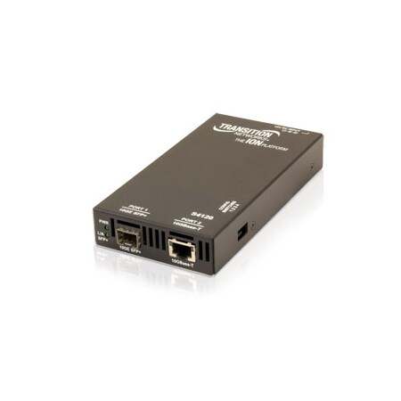 Product Description Transition - media converter<br /> Device Type Media converter - RJ-45 / SFP+<br /> Form Factor External<br /> Cabling Type 10GBase-X, 10GBase-T<br /> Data Transfer Rate 10 Gbps<br /> Data Link Protocol 10 Gigabit Ethernet<br /> Dimensions (WxDxH) 3.2 in x 6.5 in x 1 in<br /> Manufacturer Warranty Limited lifetime warranty