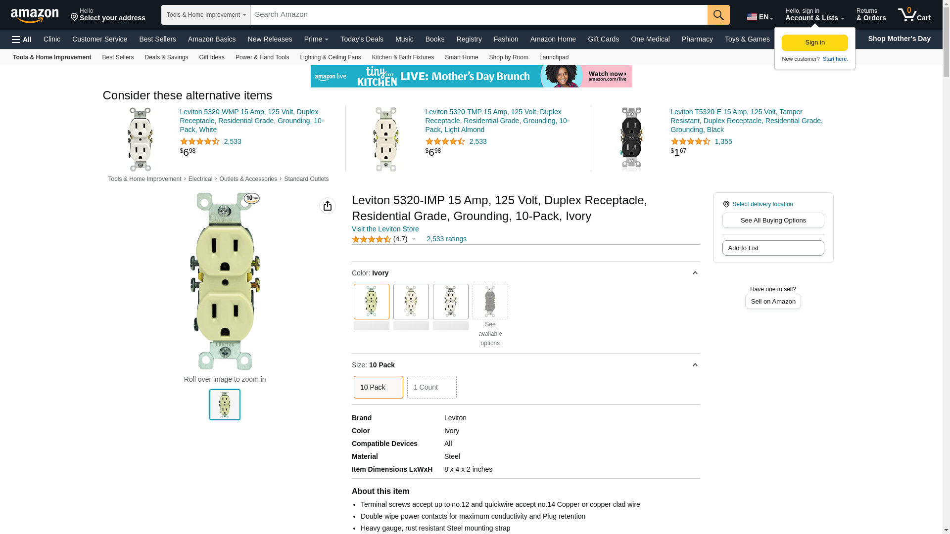 Leviton 15 amps 125 volt Ivory Outlet 5-15R 10 pk