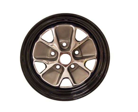 Compatible with 1966 Ford Mustang; Fairlane; Falcon with 5 x 4-1/2" Bolt Pattern. This product is not created or sold by Ford.;<br><br>Reproduction of the original optional Styled Steel wheel used on 1966 models. Has the correct 14" diameter and 5" width with a black rim. 1966 wheels were designed to be used with a trim ring, as opposed to the chrome rim used on 1965 models. Sold individually. Center cap, lug nuts and trim ring sold separately.;