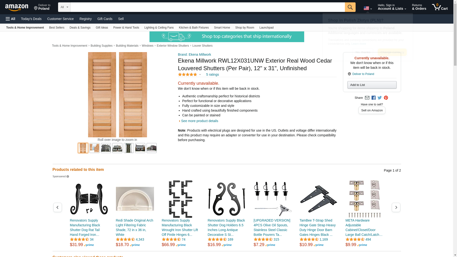 Ekena Millwork RWL12X031UNW Exterior Real Wood Cedar Louvered Shutters (Per Pair), 12" x 31", Unfinished