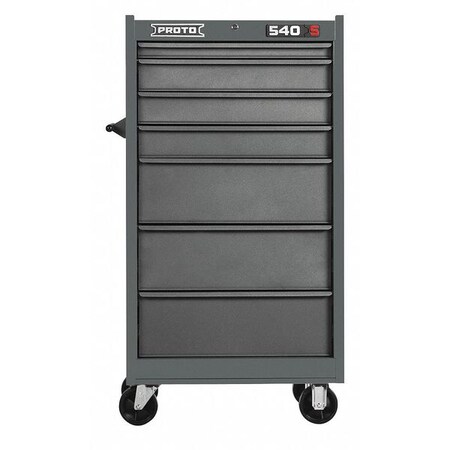Technical Specification Item Tool Tower Series 540S Width 27" Depth 18" Height 52" Number of Drawers 7 Color Gray Drawer Capacity 200 lb. Drawer Slides Ball Bearing, Full Extension Storage Capacity 13, 716 cu in. Load Rating 1800 lb. Caster Size 5" x 2" Number of Shelves 0 Material Steel Gauge 18 Work Surface Material Steel/Vinyl Caster Wheel Material Polyurethane Caster Type (2) Fixed with Lock, (2) Swivel Locking System Heavy Duty Keys Handles Easy Grip Steel Configuration Center Bank: (1) 23-1/4" W x 16-1/8" D x 1-7/8" H, (3) 23-1/4" W x 16-1/8" D x 3-15/16" H, (3) 23-1/4" W x 16-1/8" D x 8-1/16" H Finish Gloss/Matte Features Fully Extending and Recessed Drawers, Adjustable Drawer Detents, Reinforced Top and Bottom Panels For Use With Proto 540 Series Includes Drawer Liners This listing is for each.