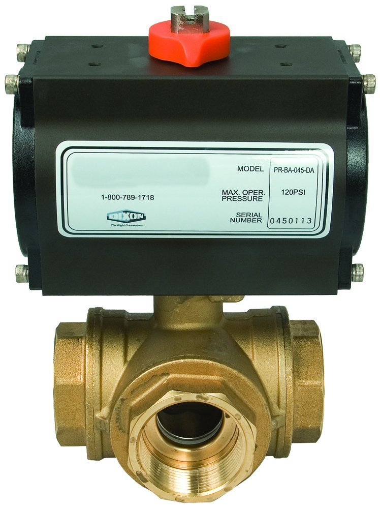 Dixon BV3BVLR-0751BCC Brass 3-Way Industrial Ball Valve, L-Port, FNPT, Rack and Pinion Aluminum Body, Double Acting, 0.75"
