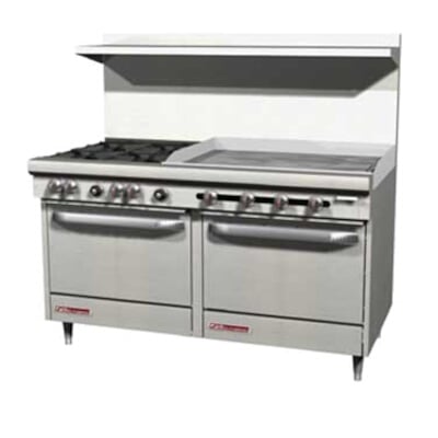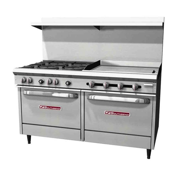 Southbend - S60DD-2G 60" Gas Open Burner/Griddle Restaurant Range - S Series - S60DD-2GL - Southbend Southbend S60DD-2GL S-Series Restaurant Gas Range, 60" W, (6) 28,000 Btu Open Burners, (1) 48,000 BtSouthbend - S60DD-2G 60" Gas Open Burner/Griddle Restaurant Range - S Series - S60DD-2GL - SouthbendGas60" W(6) 28000 Btu Open Burners(1) 48000 Btu24" Manual Griddle Left(2) 35000 Btu Standard Ovens With Snap Action Thermostat(6) Removable One Piece Cast Iron Grate TopsStainless Steel FrontSides And Removable Shelf4" Stainless Steel Front RailRemovable One Piece Crumb DrawerRemovable Grease DrawersHinged Lower Valve PanelsMetal Knobs6" Stainless Steel Adjustable LegsTotal Btu's (Nat) 286000Base: 2 Standard OvensTop: 6 Open Burners, 24" GriddleExterior Finish: Stainless Steel Front And SidesVent: Backriser With Hi-Shelf 390091, SBD-S60DD-
