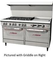 Gas range has a stainless steel front, sides and high shelf. Chrome oven handle and metal knobs. Full-size sheet pans fit front to back or side to side in standard oven. 60"Wx34"Dx591⁄2"H overall, including 6" stainless steel adjustable legs. 1075 lbs. (2) Standard ovens. LP Gas: 24,000 BTU. Natural Gas: 28,000 BTU. +175°F to +550°F thermostat. Full porcelain enameled interior. Two position nonremovable rack guides. One rack per oven included. 26"Wx261⁄2"Dx14"H interior. 24" griddle has manual controls. Removable grease pan. 1⁄2" thick, smooth-polished steel surface with grease trough. Specify left or right location. 48,000 BTU. (6) burners. LP Gas: 24,000 BTU. Natural Gas: 28,000 BTU. Removable 12"Wx12"D cast iron grates with non-clog burners. Removable one piece drip tray.