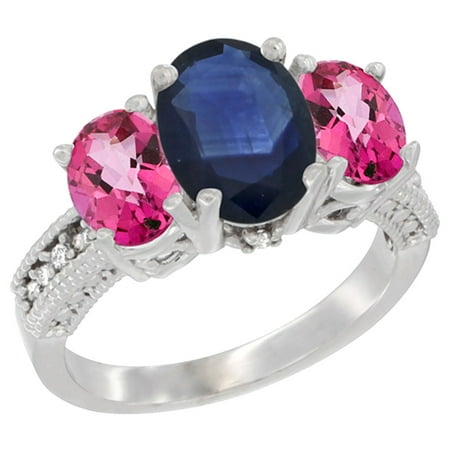 10K White Gold Diamond Natural Blue Sapphire Ring 3-Stone Oval 8x6mm with Pink Topaz, sizes5-10