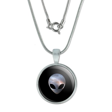 <ul> <li>This charming pendant will spruce up any outfit and become your go to favorite accessory!</li> <li>The pendant is sterling silver plated and approximately 0.75" (1.9cm) in diameter with the delightful resin-topped design as shown.</li> <li>The included snake chain is 22" (55.9cm) in length, made from brass and 95.5% sterling silver plated, and closes with a spring ring clasp.</li> <li>If you've ever wanted to go to space, then this design is perfect for you! With this galactic Alien head, you won't need to phone home.</li> <li>A Graphics and More product.</li> </ul>