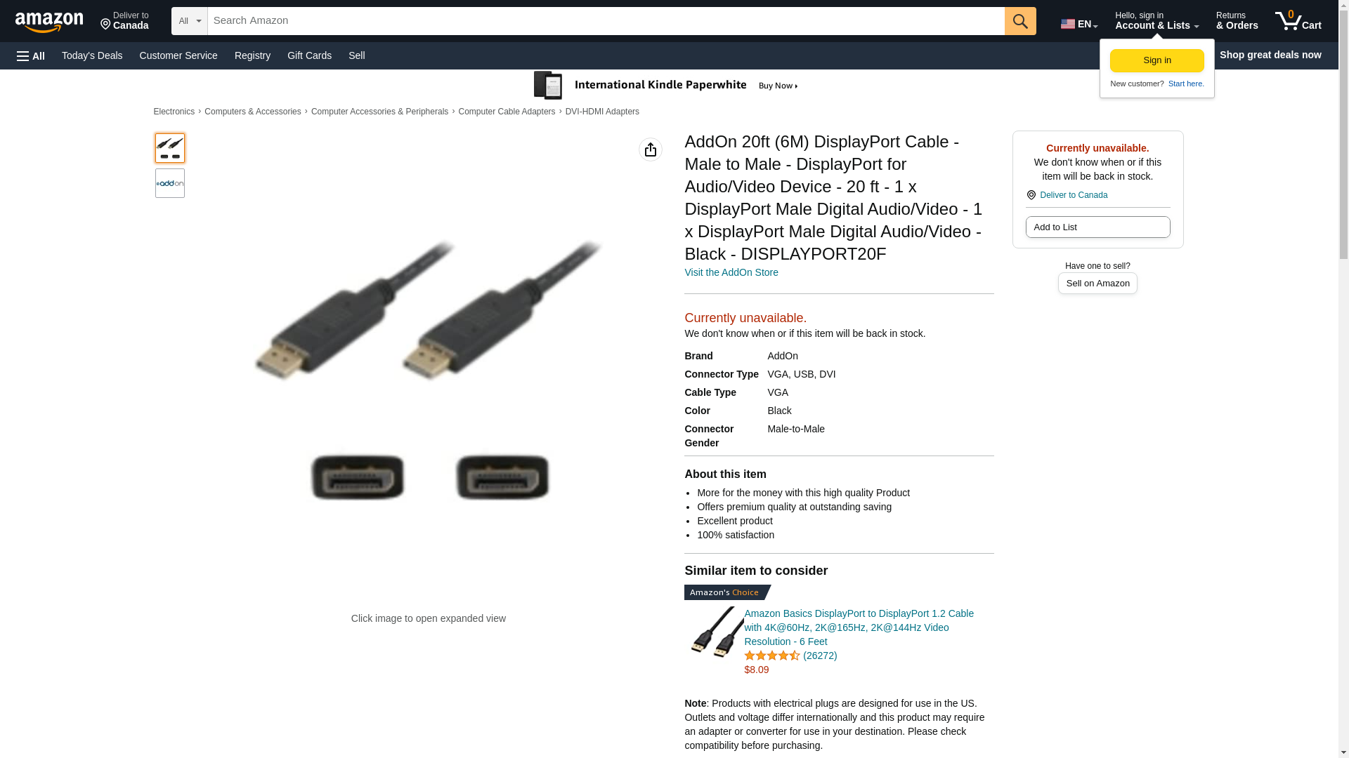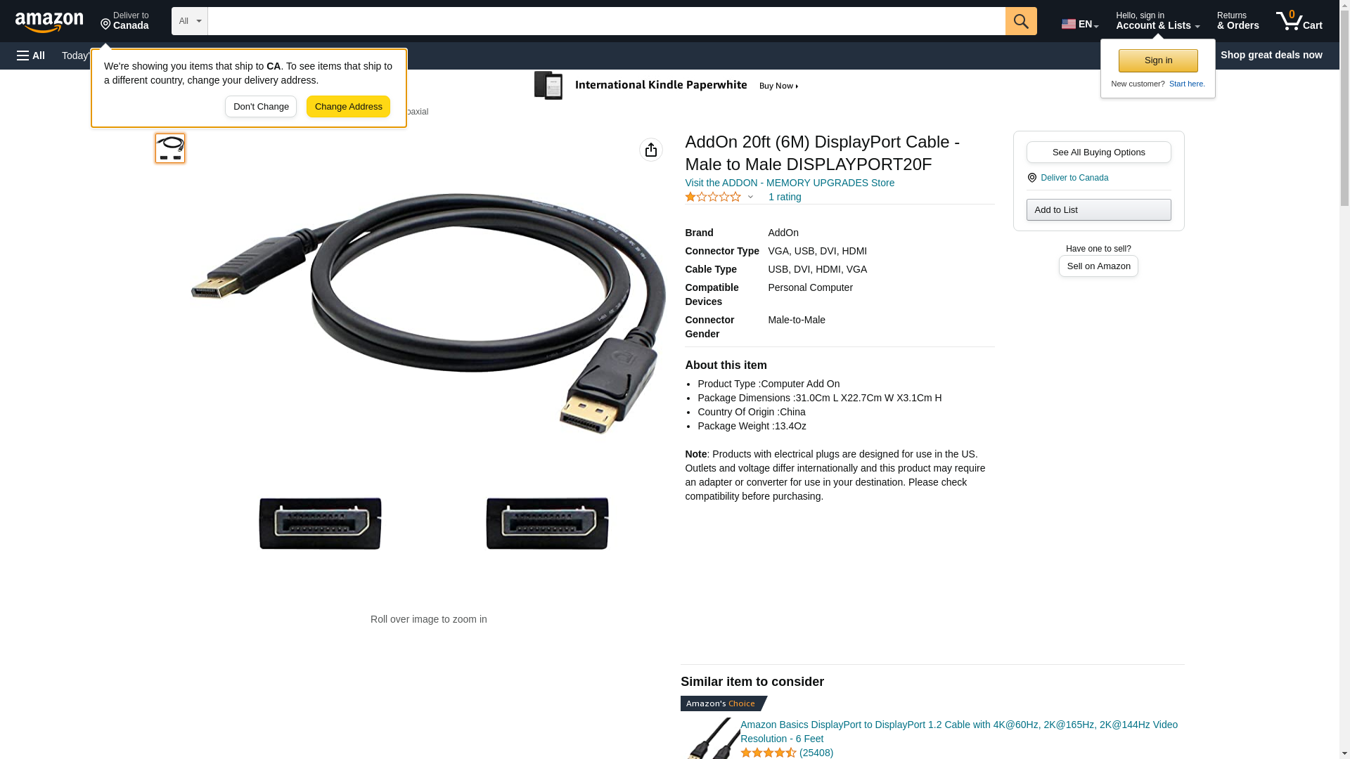 AddOn Accessories' 20 foot DisplayPort Cable can connect your video source to your display. It is capable of transmitting video, audio and USB data, replacing VGA and DVI cable technology. It also offers greater bandwidth than HDMI - up to 17 Gbps. This DisplayPort cable supports the highest resolutions available on displays today, up to WQXGA (2560x1600). HDCP and DPCP capabilities allow for full digital rights authentication and session key establishment. Rely on the quality of AddOn Accessories.<br><br><br/><br/><strong>Brand Name</strong>: AddOn<br/><strong>Cable Length</strong>: 20 ft<br/><strong>Cable Type</strong>: DisplayPort<br/><strong>Color</strong>: Black<br/><strong>Connector on First End</strong>: 1 x DisplayPort Male Digital Audio/Video<br/><strong>Connector on Second End</strong>: 1 x DisplayPort Male Digital Audio/Video<br/><strong>Product Type</strong>: A/V Cable<br/><br/><br/><br/><br/>Height 1.00 inches<br/>Width 5.30 inches<br/>Length 5.70 inches<br/>Shipping Weight 0.25 pounds<br/>Pallet Quantity 0<br/>