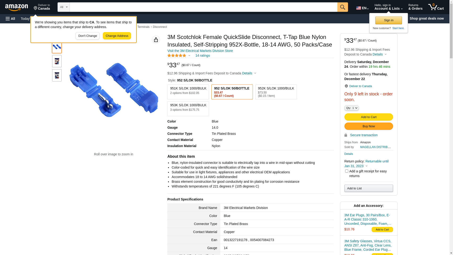 3M Scotchlok Female QuickSlide Disconnect, T-Tap Blue Nylon Insulated, Self-Stripping 952X-Bottle, 18-14 AWG, 10 Packs/Case