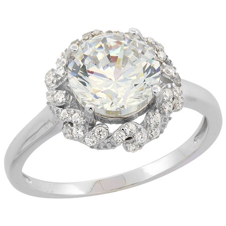 Sterling Silver Round CZ Engagement Floral Ring Rhodium Finish, 15/32 inch wide, sizes 6 - 9