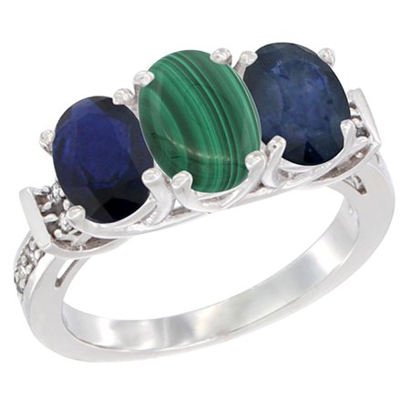 10K White Gold Natural Malachite & Blue Sapphire Sides Ring 3-Stone Oval Diamond Accent, sizes 5 - 10
