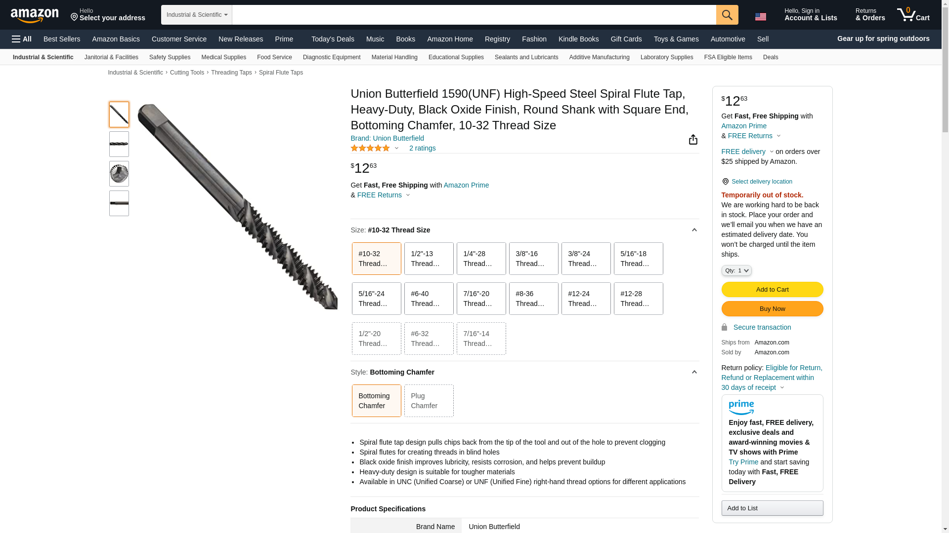 Union Butterfield 1590(UNF) High-Speed Steel Spiral Flute Tap, Heavy-Duty, Black Oxide Finish, Round Shank with Square End, Plug Chamfer, 10-32 Thread Size