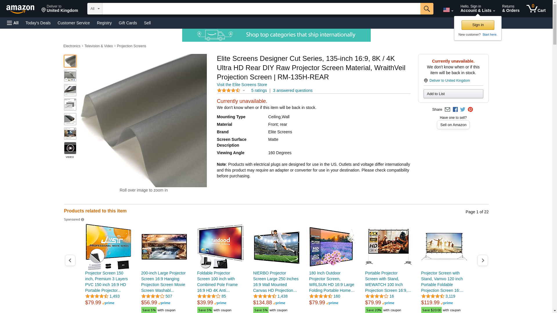 ZRM-135H-REAR Features: -Do-it-yourself; pre-cut projection screen materials are perfect for custom, home theater and budget-friendly applications.. -Featuring Elite's award winning, high-end, industry grade front and rear projection screen materials used in Elite Screens extensive catalog.. Product Type: -Portable. Application: -Home theater/Outdoor. Projection Type: -Rear. Screen Surface: -Grey. Screen Format: -HDTV (16:9). Screen Gain: -Greater than 2.0. Dimensions: Overall Height - Top to Bottom: -72". Overall Width - Side to Side: -124". Diagonal Size: -135". Overall Product Weight: -5.1 lbs.