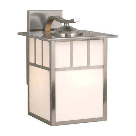 Flat strips of stainless steel outline white tiffany style glass panes in the Mission collection. The simple design of this fixture has a mission style look perfect for Frank Lloyd Wright prairie inspired decors. This outdoor wall light is ideal for your porch, entryway, garage, or any other area of your home.