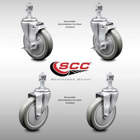 5 Inch SS Gray Polyurethane Swivel ? Inch Threaded Stem Caster Brakes SCC, 2PK