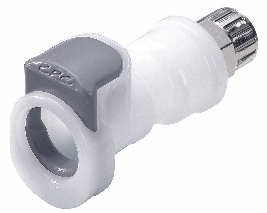 'Inline Coupler, Tube Fitting Material Acetal, Tube Size 3/8 In., Pipe Size (Fittings) 3/8 In., APC Series, Shut-Off, Tube Inside Dia. 1/4 In., Tube Outside Dia. 3/8 In., Coupling Size 1/4 In., Max. Pressure 120 psi, Temp. Range -40 Degrees to 180 Degrees F, Length 2.07 In., Body Dia. 1.3 In., Color White, For Use With APC Inserts, Standards NSF 61, NSF 51, FED 209E'