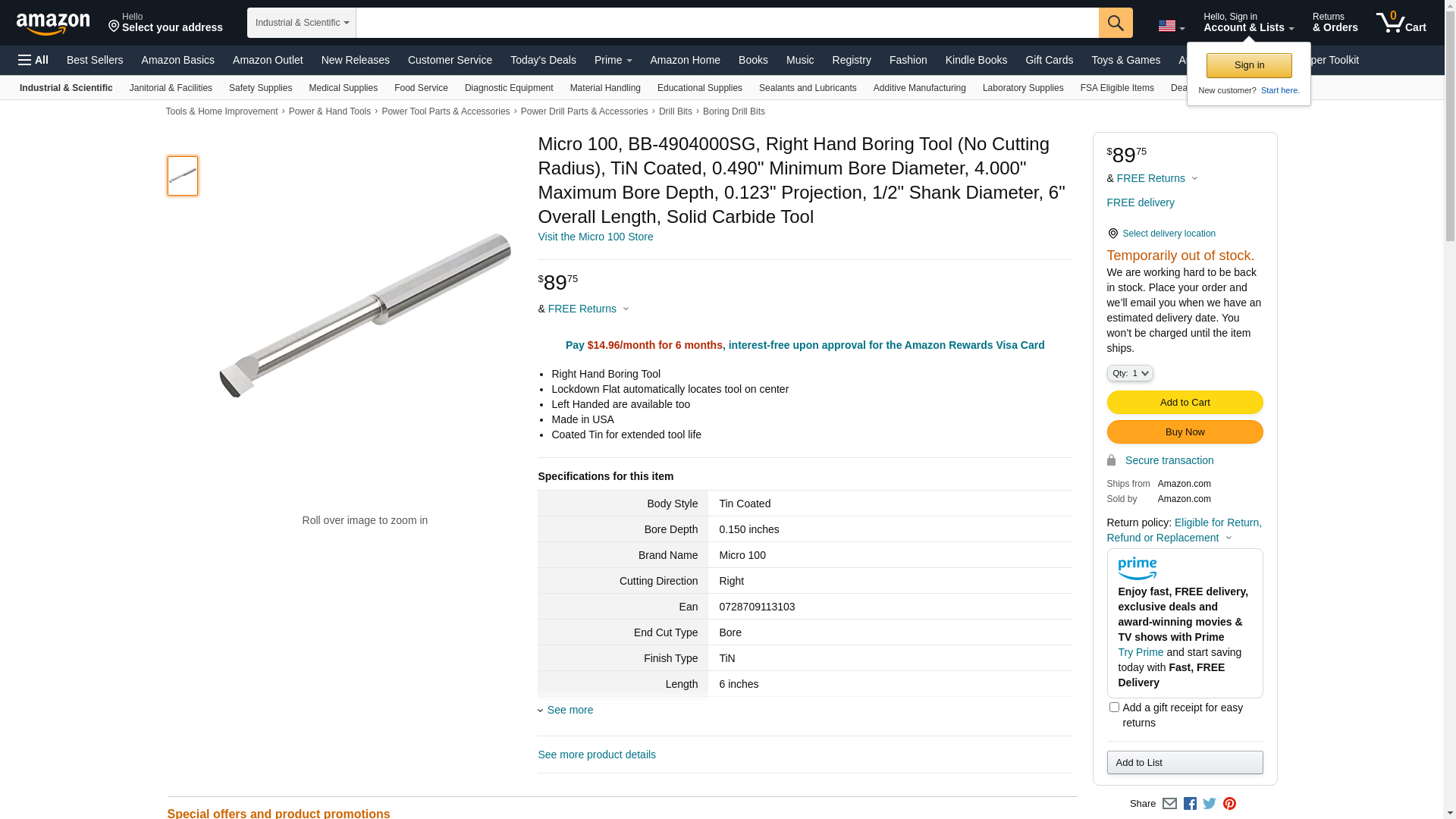 Micro 100, BB-4904000SG, Right Hand Boring Tool (No Cutting Radius), TiN Coated, 0.490" Minimum Bore Diameter, 4.000" Maximum Bore Depth, 0.123" Projection, 1/2" Shank Diameter, 6" Overall Length, Solid Carbide Tool
