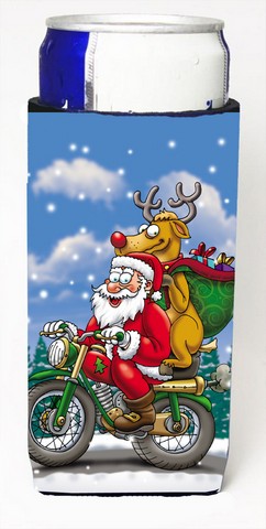 Caroline's Treasures APH8996MUK Christmas Santa Claus on a Motorcycle Ultra Hugger for slim cans Can Cooler Sleeve Hugger Machine Washable Drink Sleeve Hugger Collapsible Insulator Beverage Insulated