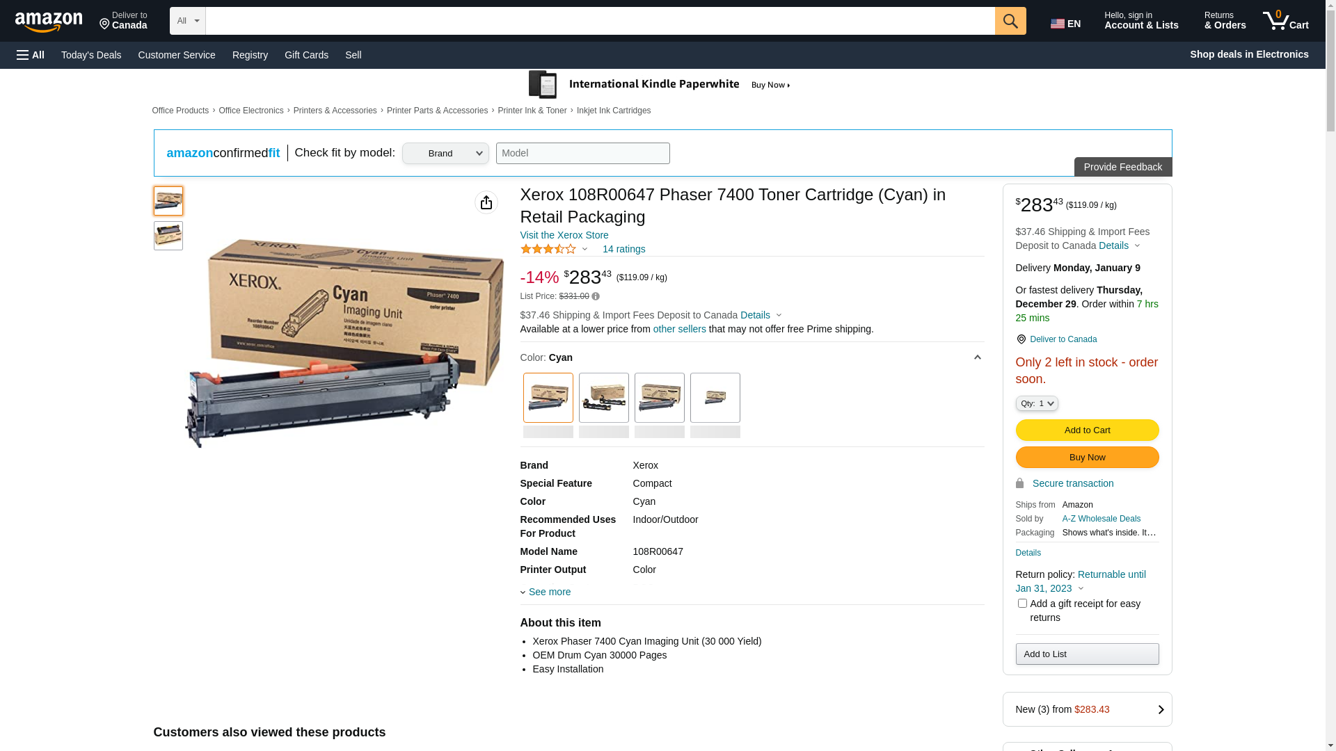 | Feature | 1 Cyan 108R00647 Phaser 7400 Cyan Imaging Unit (30,000 Yield) |