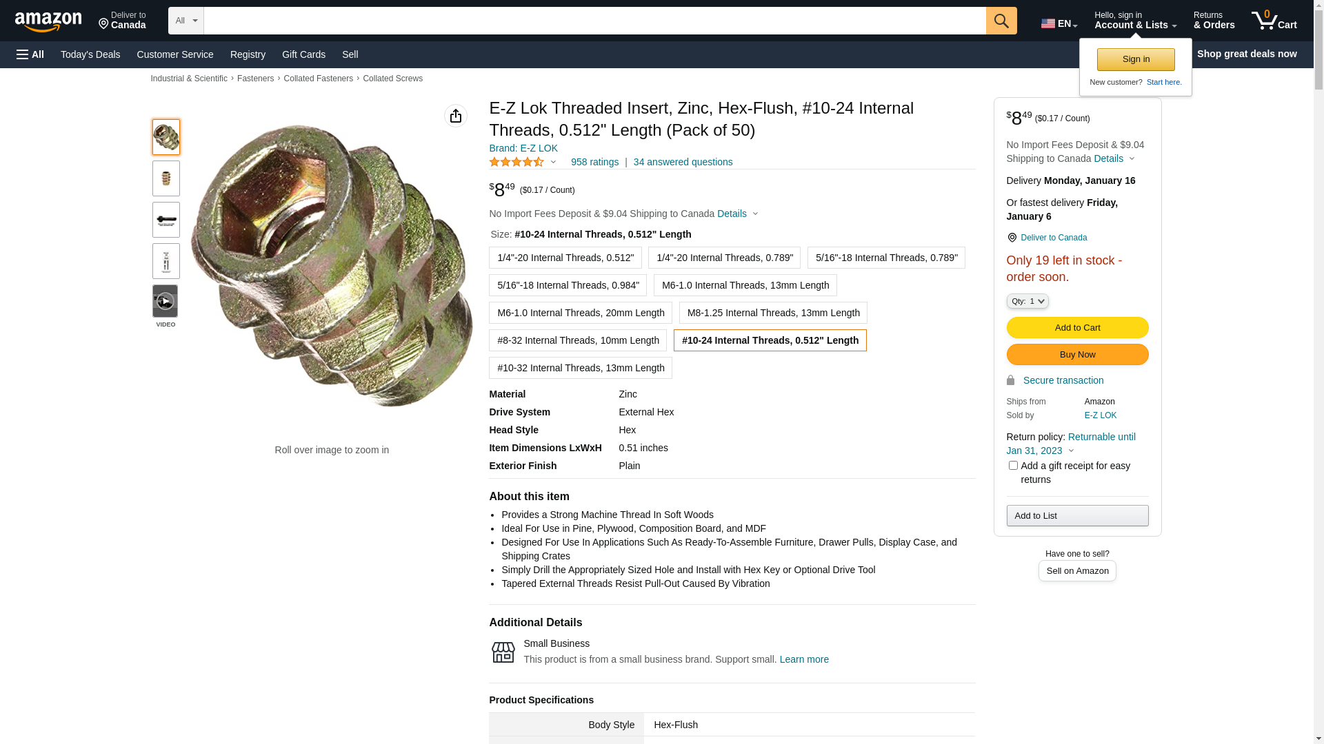 E-Z Lok Threaded Insert, Zinc, Hex-Flush, #10-24 Internal Threads, 0.512" Length (Pack of 50)