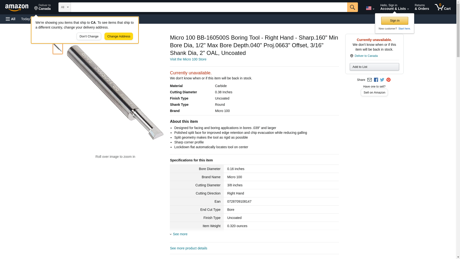 Micro 100 BB-160500S Boring Tool - Right Hand - Sharp, 176" Min Bore Dia, 1/2" Max Bore Depth, 040" Proj, 0663" Offset, 3/16" Shank Dia, 2" OAL, Uncoated