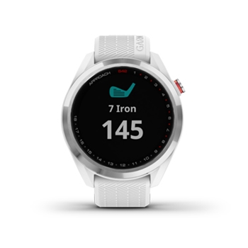 1.2" easy-to-read color touchscreen display with interchangeable quick release bands<br>More than 42,000 CourseView maps preloaded from around the world<br>Green View feature allows manual pin positioning; quickly reference distances to the front, middle and back of the green as well as hazards and doglegs<br>The AutoShot round analyzer measures and auto-records detected shot distances distances (lie and ball contact may affect shot tracking) and pairs with optional Approach CT10 club tracking sensors (sold separately) for more automatic game tracking capabilities<br>Offers smart notifications (when paired with a compatible smartphone) and estimated activity-tracking features such as steps, sleep and built-in sports profiles<br>Pair with the Garmin Golf app (when downloaded on a compatible smartphone) for live scoring, automatic scorecard uploads and to review all your stats in one place<br>Battery life: up to 15 hours in GPS mode, and up to 10 days in smartwatch mode<br>COLOR TOUCHSCREEN<br>Large 1.2" easy-to-read color touchscreen display with metal bezel is stylish and lightweight.<br>QUICK RELEASE BANDS<br>If you like to change watch bands as often as you change your course, no problem. Choose from interchangeable quick release bands.<br>GOES BEYOND THE COURSE<br>Whether you just got done with a game and find yourself in the clubhouse or you want to hit the town, Approach S42 is great for everyday wear.<br>GO GREEN<br>Quickly reference distances to the front, middle and back of the green so you have all the data you need for the perfect shot.<br>SMART NOTIFICATIONS<br>Receive emails, texts and alerts right to your watch when paired with a compatible smartphone.<br>