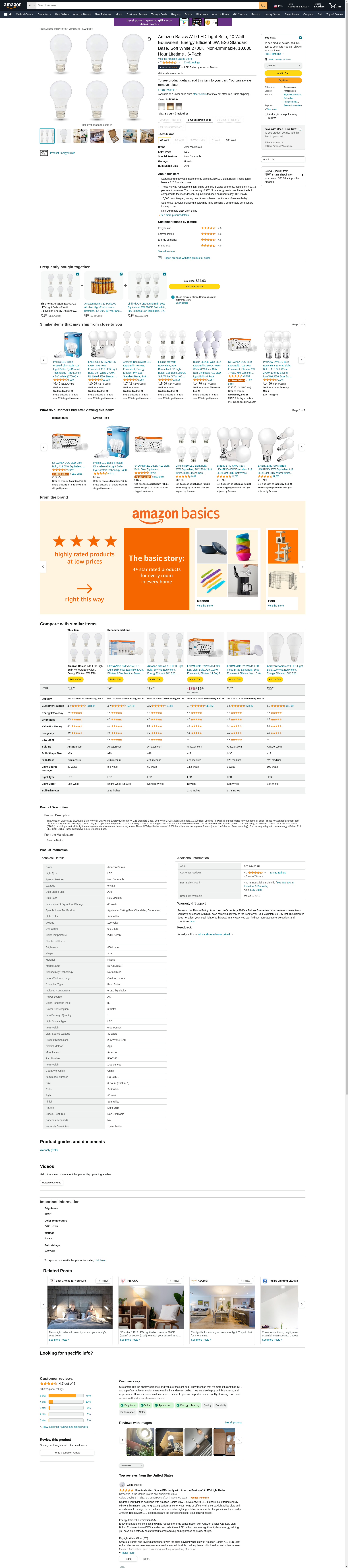 AmazonBasics 40W Equivalent, Soft White, Non-Dimmable, 10,000 Hour Lifetime, A19 LED Light Bulb | 6-Pack