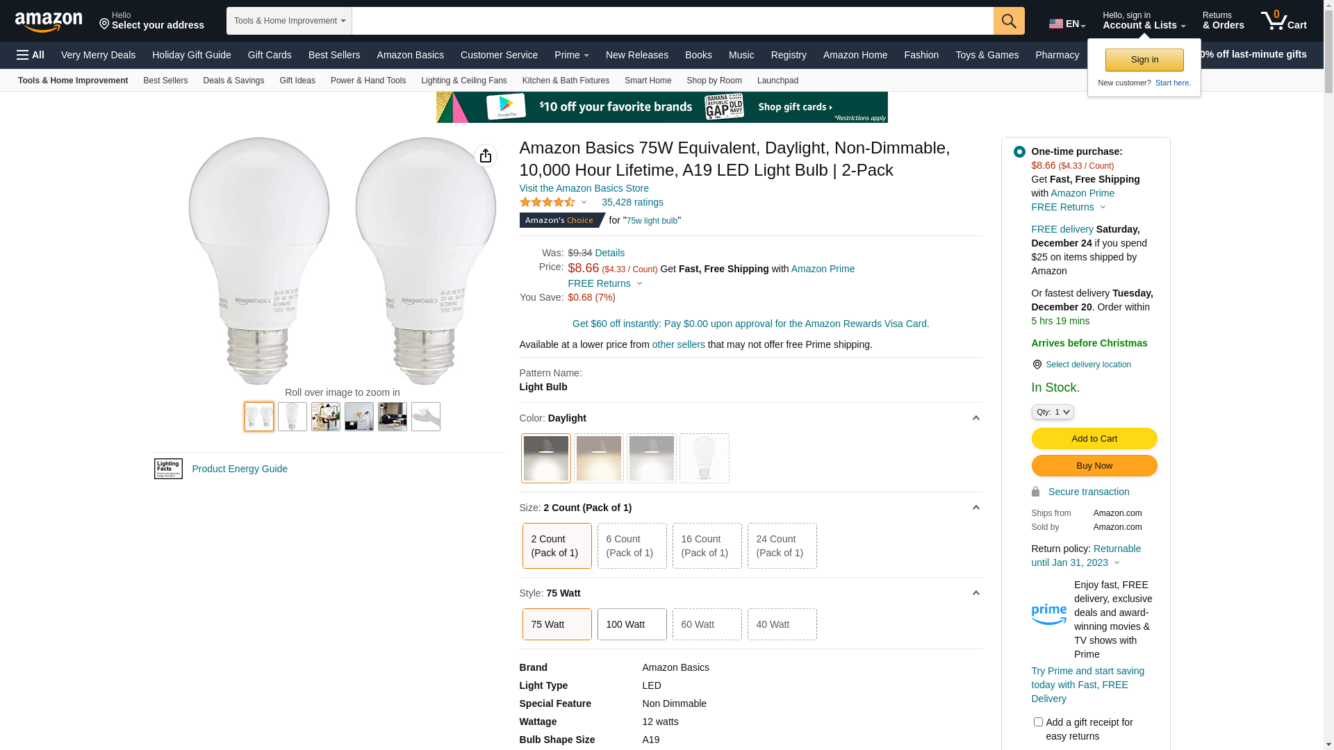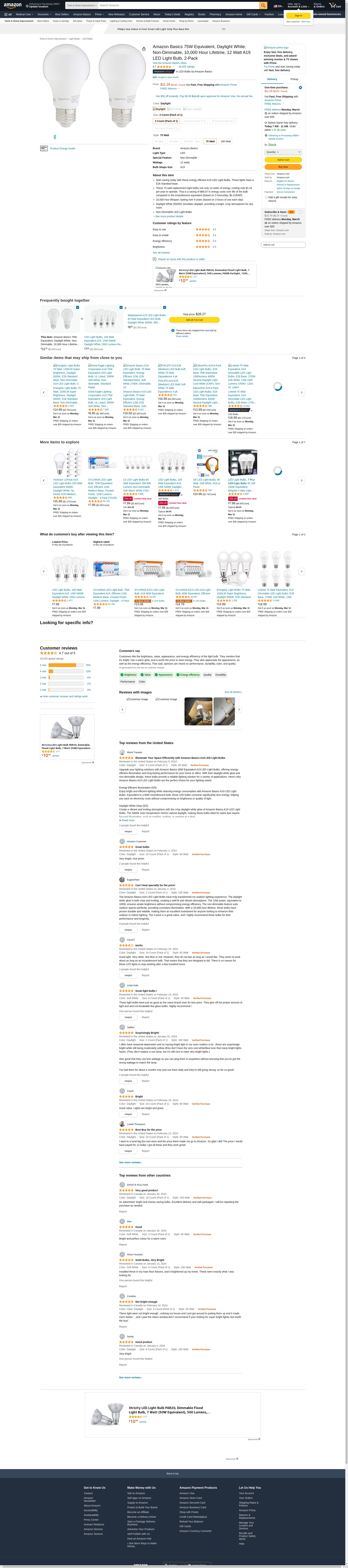 Amazon Basics 60W Equivalent, Daylight, Non-Dimmable, 10,000 Hour Lifetime, A19 LED Light Bulb | 2-Pack