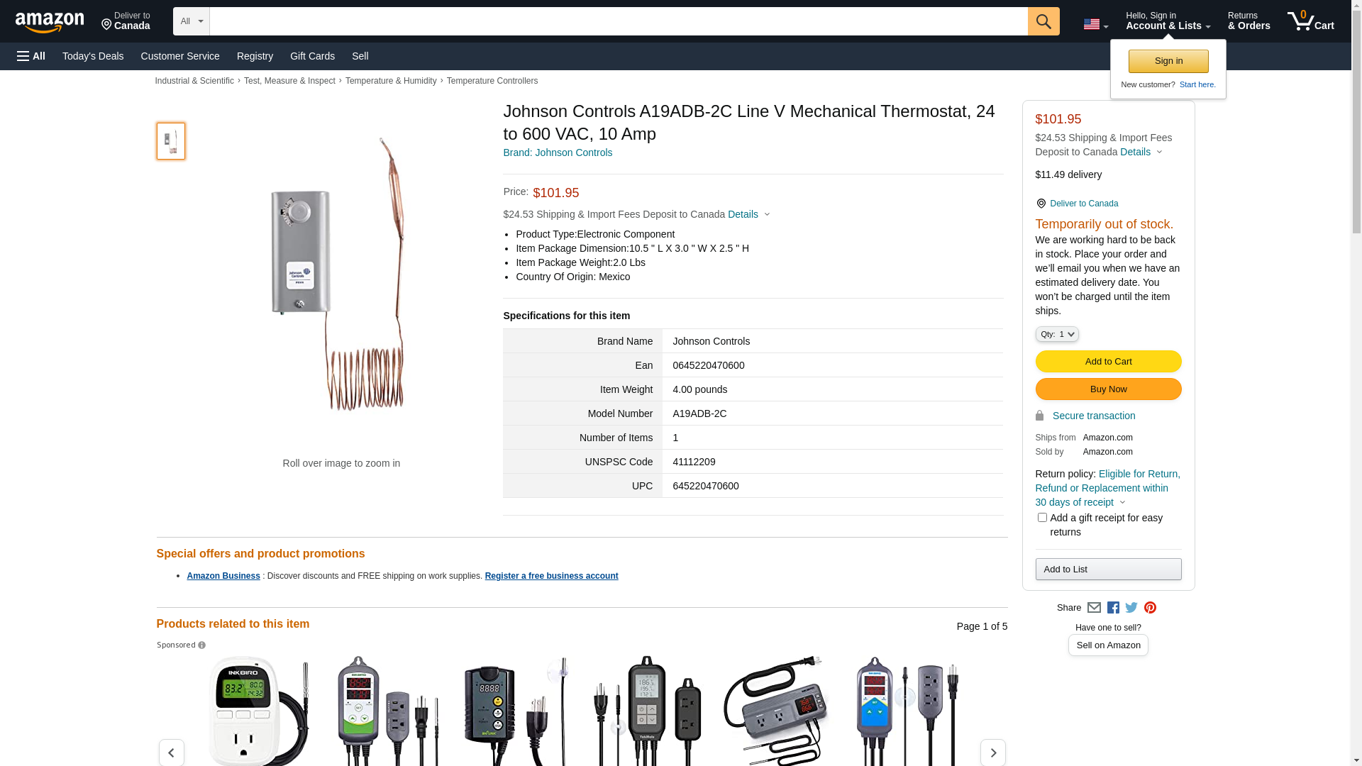 Johnson Controls A19ADB-2C Line V Mechanical Thermostat, 24 to 600 VAC, 10 Amp