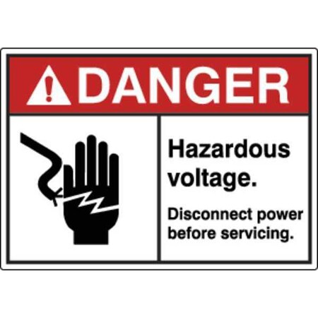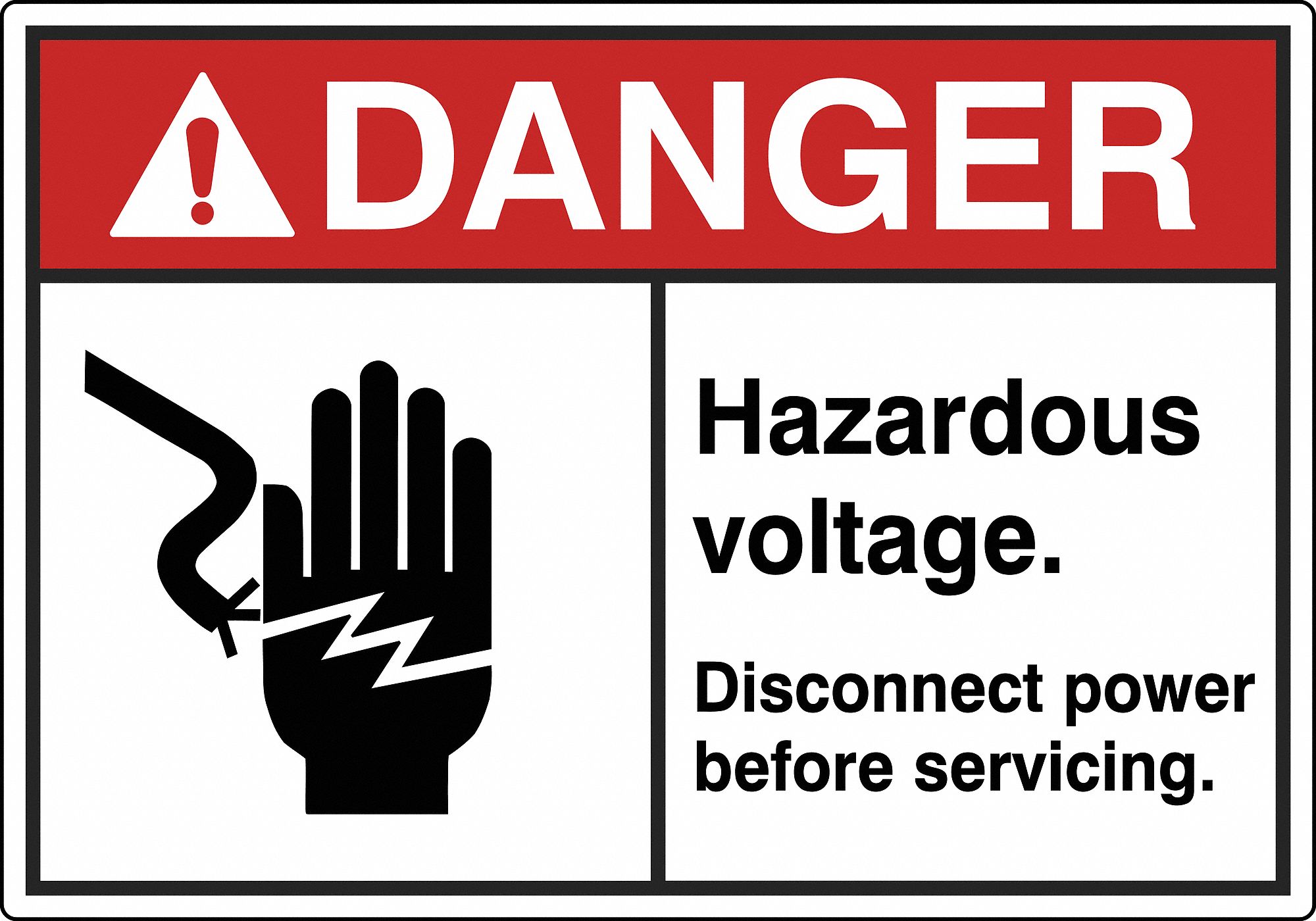 - Price For: Each Legend Style: Text and Symbol Standards: ANSI Z535.2; ANSI Z535.4 Self-Adhesive: Yes Background Color: White Legend Color: Black Metal Detectable: No Shape: Rectangle Legend: Danger Hazardous Voltage. Disconnect Power Before Servicing. Language: English No. of Labels: 5 Height: 3-1/2" Header: Danger Legend/Background Color: Red, Black/White
