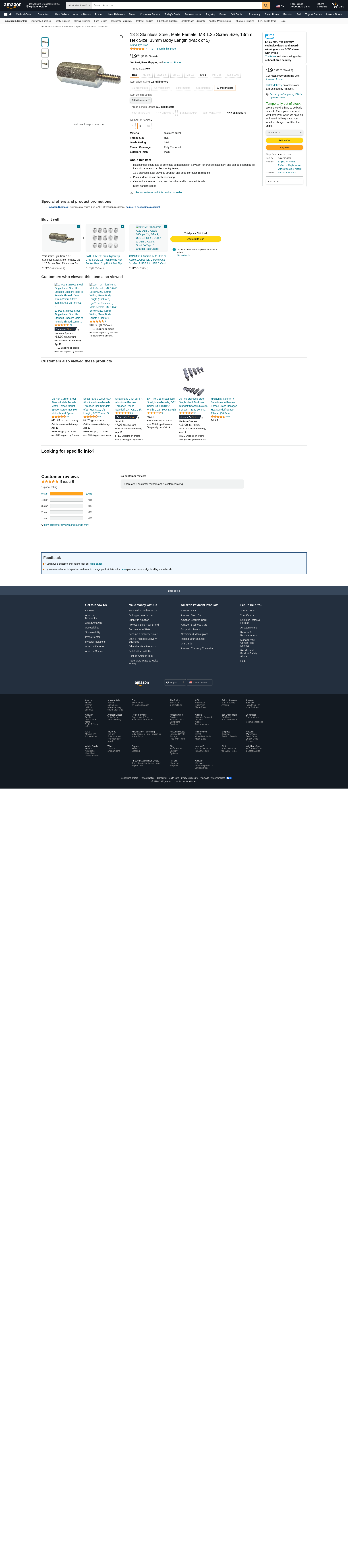 Lyn-Tron, 18-8 Stainless Steel, Male-Female, M8-1.25 Screw Size, 13mm Hex Size, 33mm Body Length (Pack of 5)