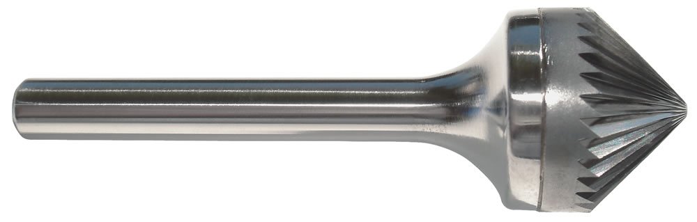 Carbide Bur, Shape Cone, Cutter Dia. 3/4 In., Shank Size 1/4 In., Overall Length 2-1/2 In., Length of Cut 3/8 In., Cutting Edge Type Single Cut, Angle 90 Degree, Shank Material Steel, Trade Number SK-7, Application Acute Angle Machining, Chamfering and Countersinking