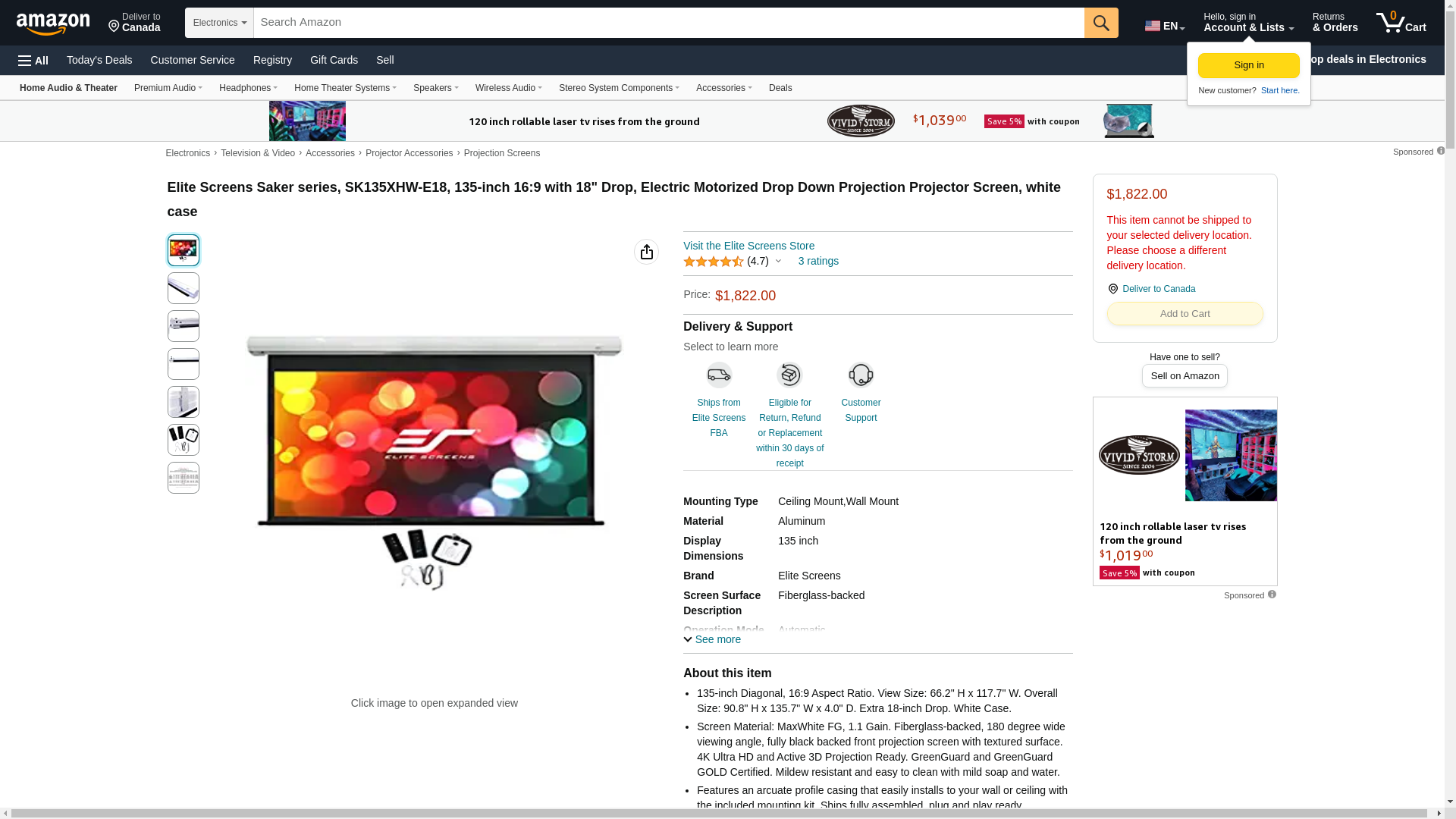 | Feature | 135-inch Diagonal, 16:9 Aspect Ratio. View Size: 66.2" H x 117.7" W. Overall Size: 90.8" H x 131.2" W x 4.0" D Extra 18-inch Drop. White Case. |
