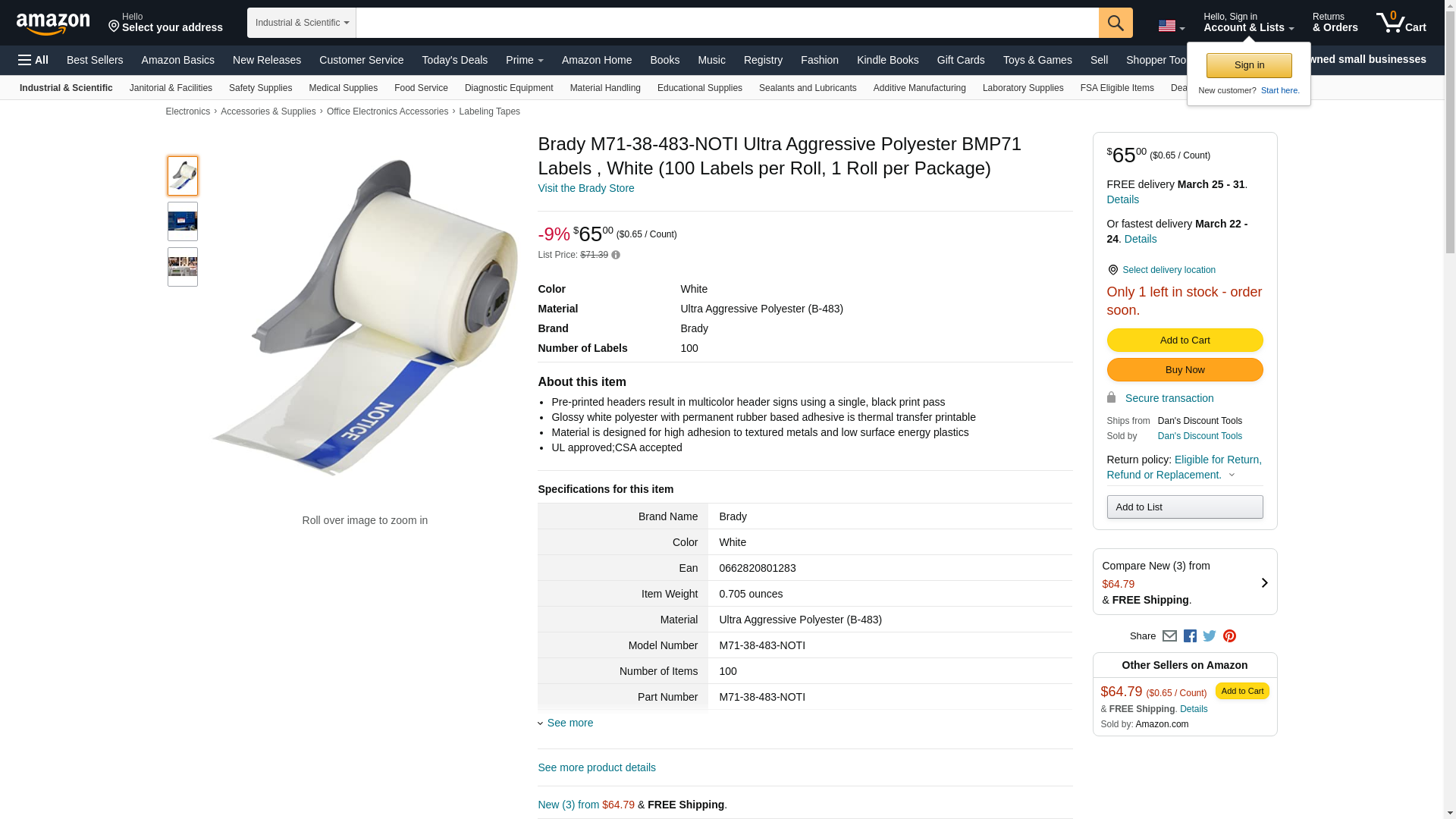 Brady M71-38-483-NOTI Ultra Aggressive Polyester BMP71 Labels , White (100 Labels per Roll, 1 Roll per Package)