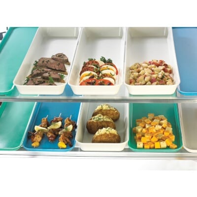 These display trays are dishwasher safe for sanitizing. The platters are made of fiberglass and they are white. The display trays are great for product sampling. The platters are conveniently deep to hold more product. The display trays measure 8" x 30" x 2" (L x W x H).