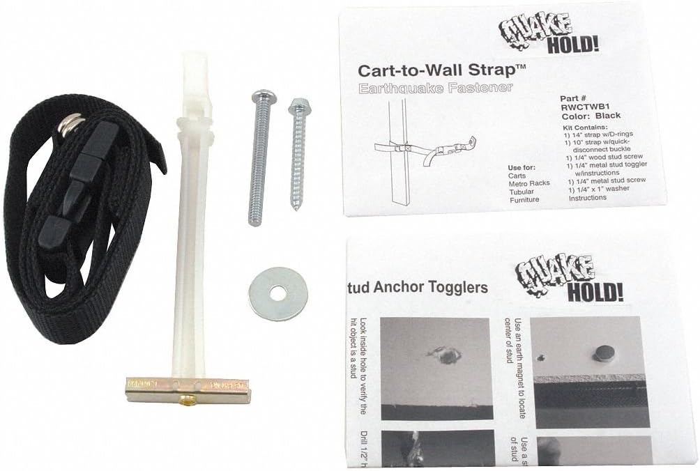 The QuakeHOLD! cart-to-wall strap earthquake fastener helps secure carts, metro racks, and tubular furniture for IBC compliance. Includes 14" strap with D-rings, 10" strap with quick-disconnect buckle, 1/4" wood stud screw, 1/4" metal stud toggle with instructions, 1/4" x 1" washer, and instructions. Cart-to-Wall Strap, Black