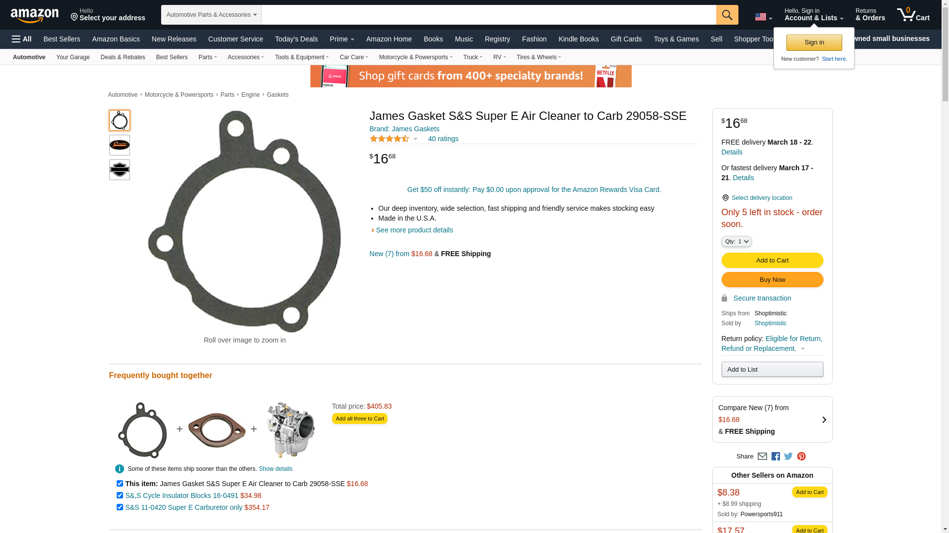 Genuine James JGI-29058-SSE Carburetor to Air Cleaner Gasket<br />For Bikes w/ S&S Super E Carburetors<br />Made in the USA<br />Sold Individually