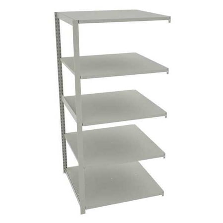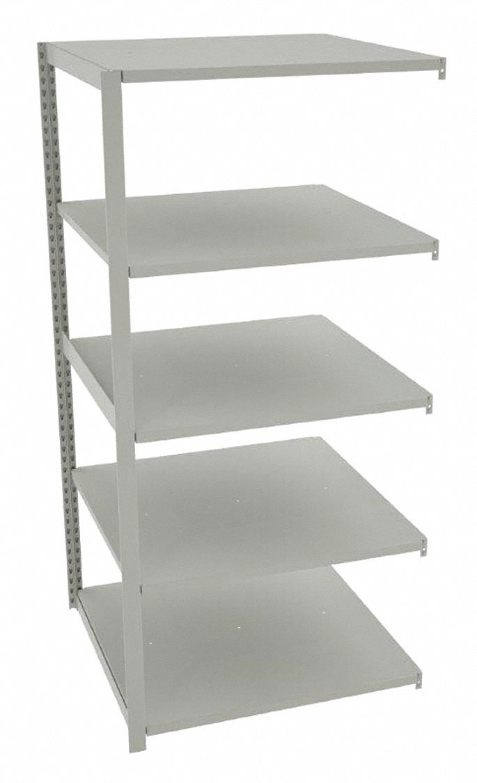 Boltless Shelving, Low Profile, Overall Depth 36 in, Overall Height 78 in, Overall Width 36 in, Shelf Gauge 14 ga, Shelf Adjustment Increments 1 1/2 in, Steel, Steel, Steel, (8) Shelf Reinforcements, Shelf Supports, Upright, Includes Decking Yes, 900 lb, Whole Unit Load Capacity 4,500 lb, Add-On, Open, Post Gauge 18 ga, Number of Shelves 5, Powder Coated, Medium-Duty, Light Gray